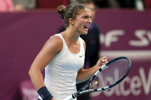 Italy’s Sara Errani celebrates after winning her 21st Paris WTA Open tennis match against Spain’s Carla Suarez Navarro on February 1, 2013 in Paris. Errani won 7-5, 4-6, 7-5.