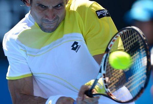 Spain’s David Ferrer plays a return during his match against Tim Smyczek at the Australian Open in Melbourne on January 16, 2013. Fourth seed Ferrer was extended by 125th-ranked American Smyczek before clinching a 6-0, 7-5, 4-6, 6-3 win in 2hr 38min on Margaret Court Arena.
