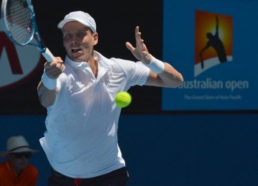 Tomas Berdych of the Czech Republic plays a return during his match against France’s Guillaume Rufin at the Australian Open on January 16, 2013. Berdych swept into the next round with a straight-sets win.