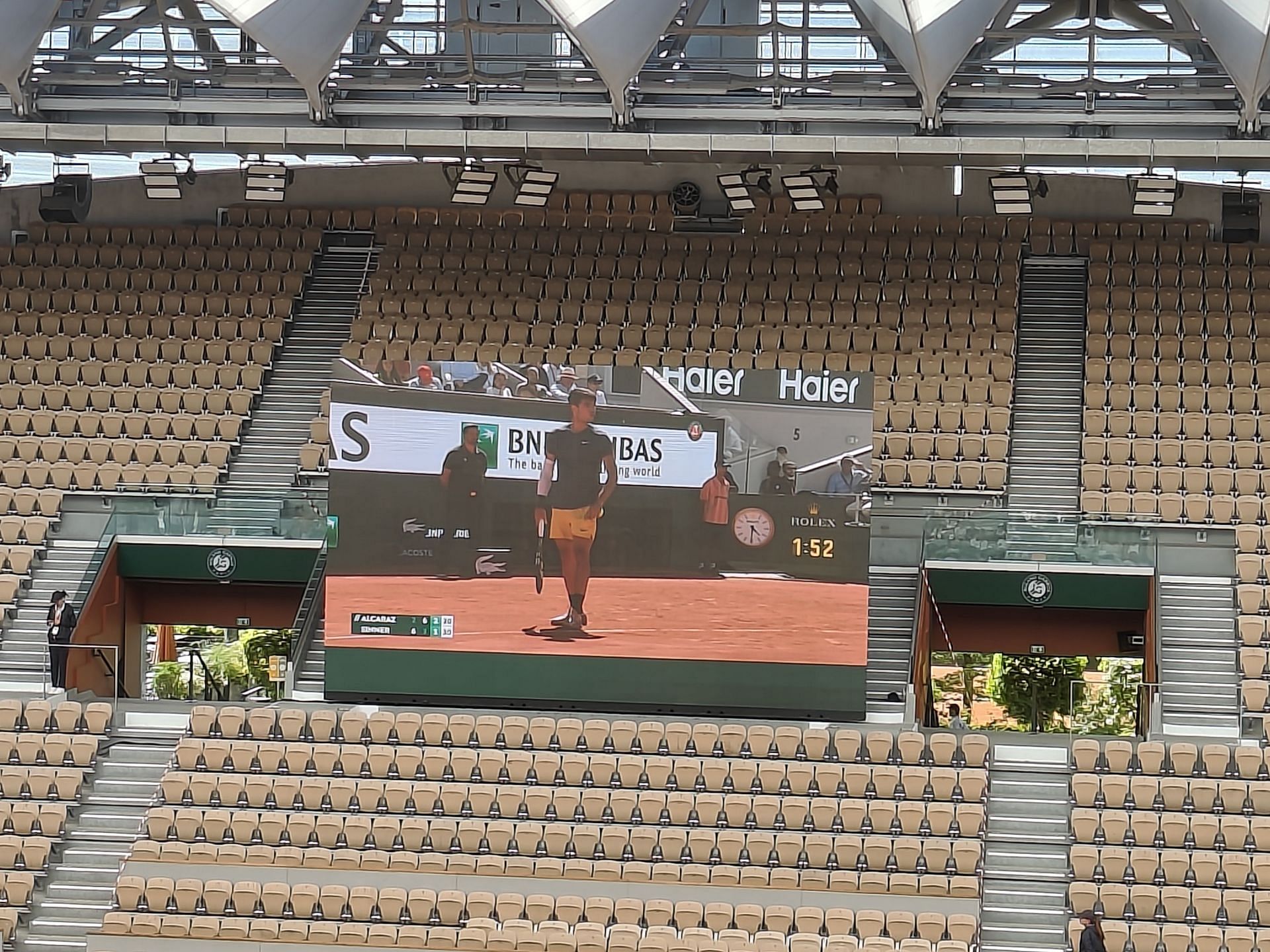 Alcaraz fights back though. The Spaniard, already a Wimbledon and US Open champion, wins the second set 6-3. At this point, a message flashes on the screen that the match is also being shown on the big screen inside Court Suzanne-Lenglen (the second biggest court at the French Open).