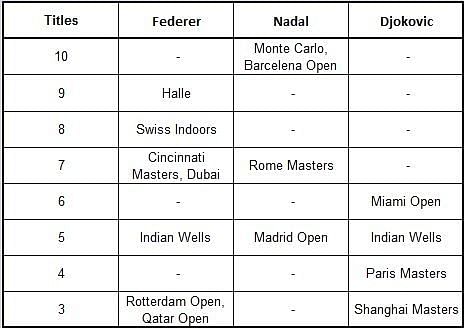 Note: Djokovic shares the Miami Open record with Agassi and the Shanghai Masters record with Murray.