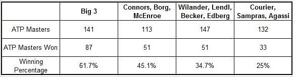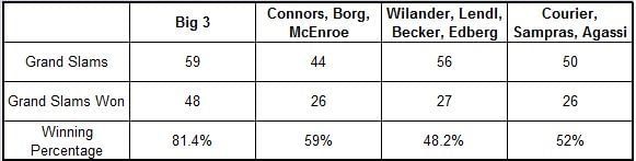 But just how dominant has the Big 3 been? Let's look at the breakdown of the stats and compare them with previous 'golden generations' in the Open Era - Jimmy Connors / Bjorn Borg / John McEnroe, Mats Wilander / Ivan Lendl / Boris Becker / Stefan Edberg and Jim Courier / Pete Sampras / Andre Agassi.