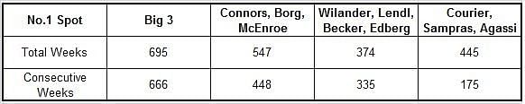 Since Federer ascended to to the top of the rankings on February 2, 2004, the No. 1 spot has been held exclusively by the Big 3 and Murray: an amazing figure of 736 total and consecutive weeks. Federer leads with 305 weeks as No. 1, followed by Djokovic with 223 weeks, Nadal with 167 weeks, and Murray with 41 weeks.