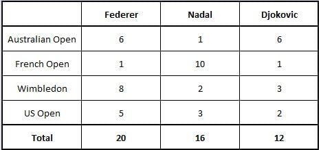 The Big 3 have won 13 of 15 Australian Opens since 2004, 13 of 14 French Opens since 2005, 12 of 14 Wimbledon titles since 2003, and 10 of 14 US Opens since 2004.