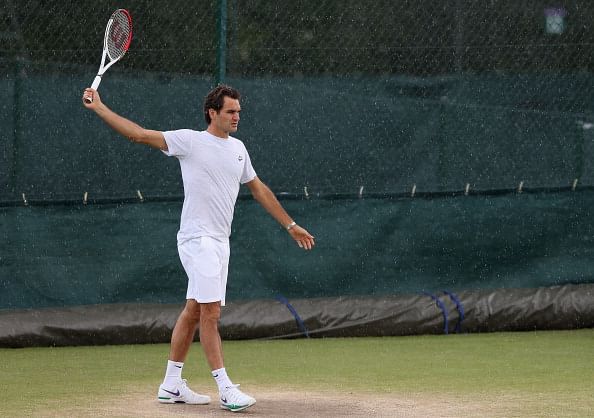 LONDON, ENGLAND – JULY 01: Roger Federer of Switzerland practices in the rain at Wimbledon on July 1, 2012 in London, England.
