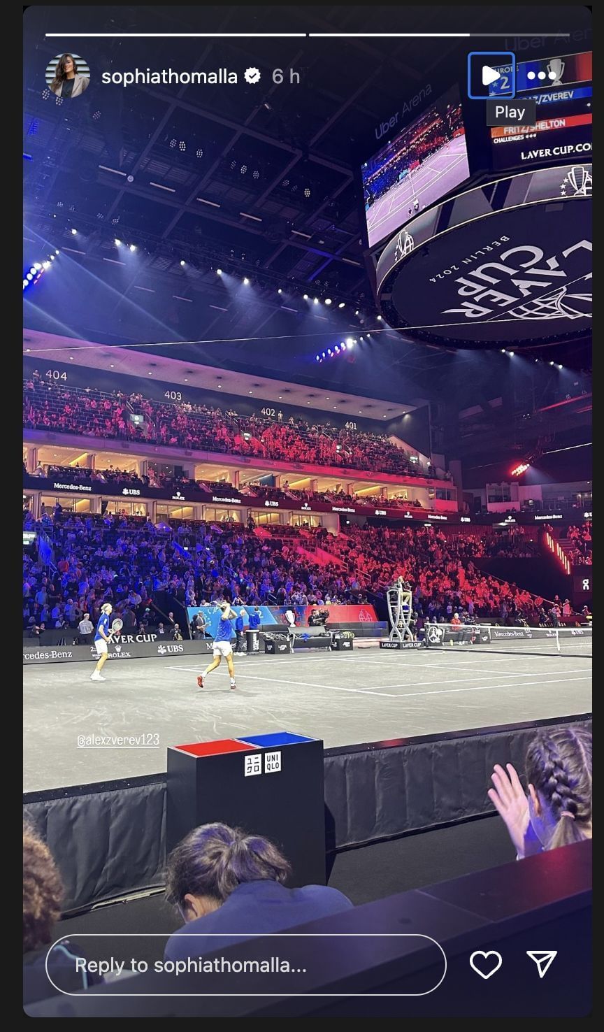 Alexander Zverev's girlfriend, Sophia Thomalla, watched her boyfriend live from the sidelines and shared a picture from his Laver Cup doubles match on her Instagram story. Zverev could be seen focused, anticipating a shot, while his partner Carlos Alcaraz played a backhand.