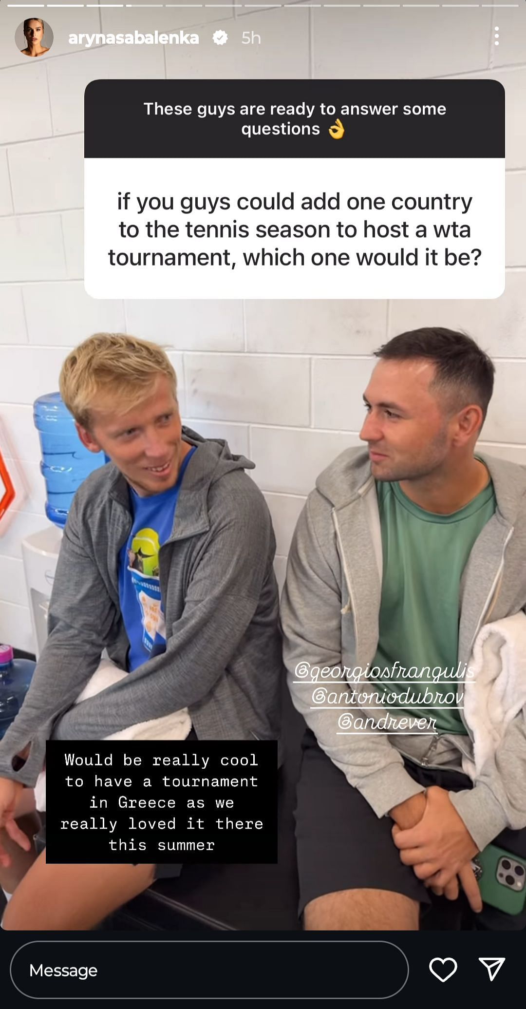 On Tuesday, December 24, Sabalenka took to Instagram Stories and shared answers given by her coach Anton Dubrov, and hitting partner Andrei Vasilevski to fans' questions. One of the questions asked the duo regarding their thoughts on the WTA potentially adding a tournament to the women's tennis calendar in a new country. Dubrov and Vasilevski's answer read: