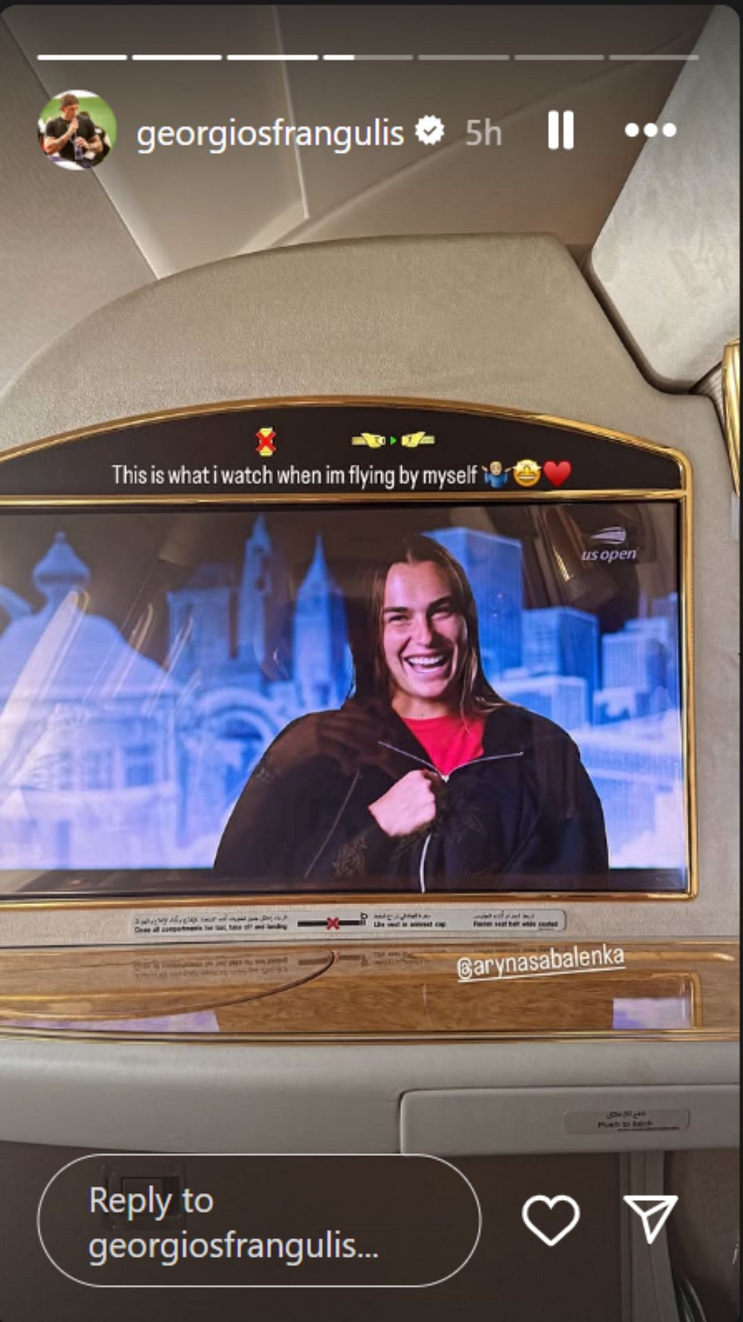 Recently, Frangulis shared an image from his flight on Instagram. He was seen spending time watching videos of his girlfriend, the WTA World No. 1, Sabalenka. The video was seemingly from the US Open. He tagged the Belarusian and showed love in the caption with a heart emoji, writing: