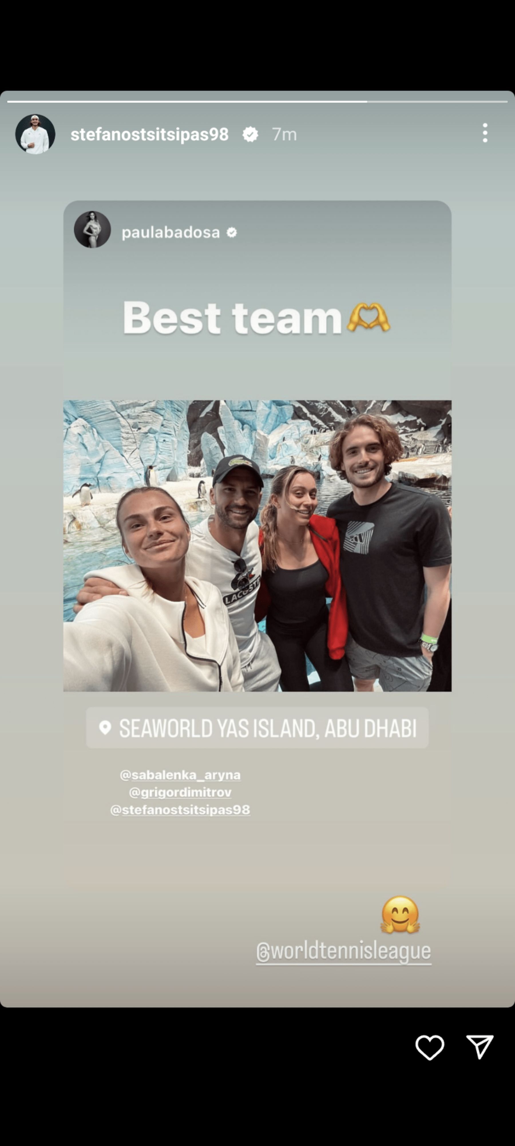 Badosa and Tsitsipas, part of Team Kites at the 2023 WTL, landed in Abu Dhabi earlier this week. Ahead of the exhibition event, the couple explored UAE's capital city with Dimitrov and Sabalenka, including a visit to the SeaWorld marine life theme park.