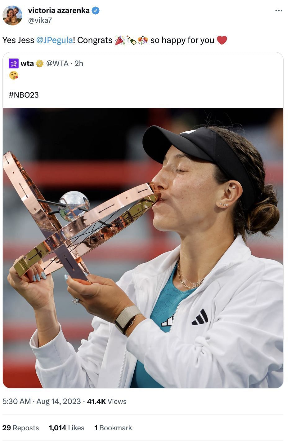 "Yes Jess @JPegula! Congrats so happy for you," Azarenka tweeted.