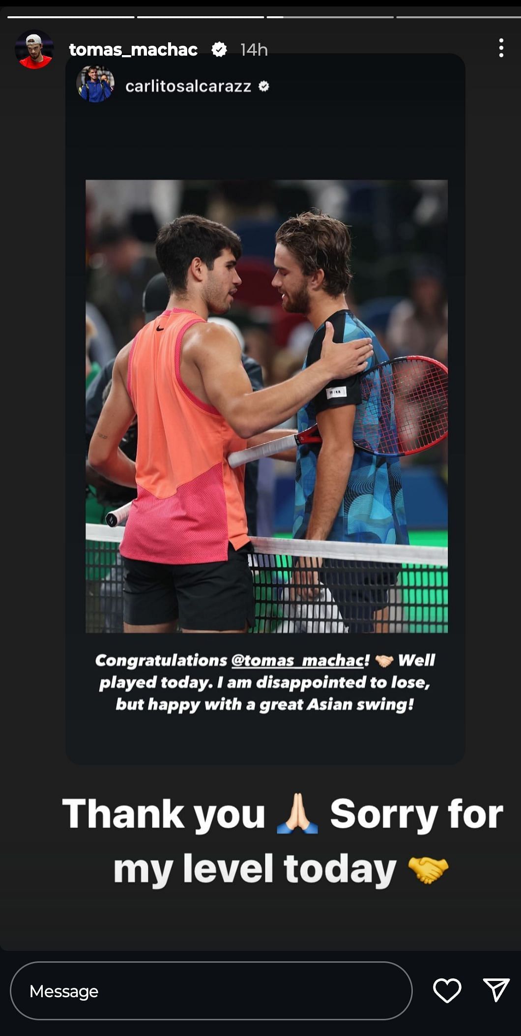 "Thank you Sorry for my level today," Machac responded, resharing Alcaraz's Instagram story.
