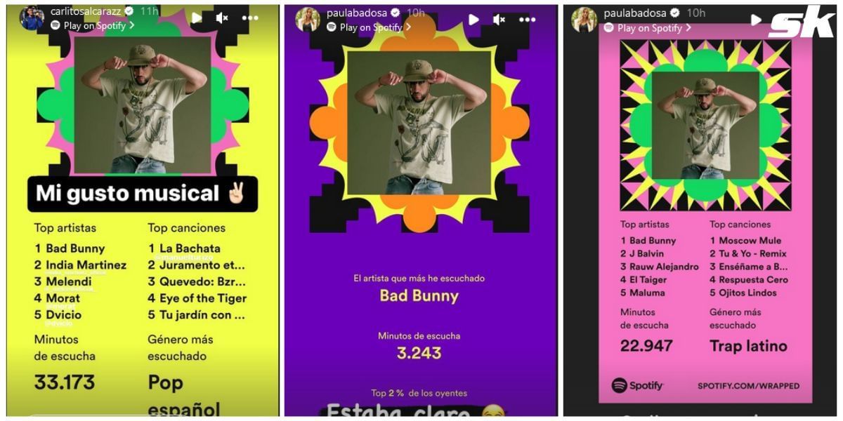 Badosa's Spotify Wrapped also featured Bad Bunny as her most-played artist of the year. J Balvin, Rauw Alejandro, El Taiger and Maluma followed the Puerto Rican. Bad Bunny's "Moscow Mule" was her top song of 2022, while another song of his, "Ojitos Lindos," also cracked the Spaniard's top five.