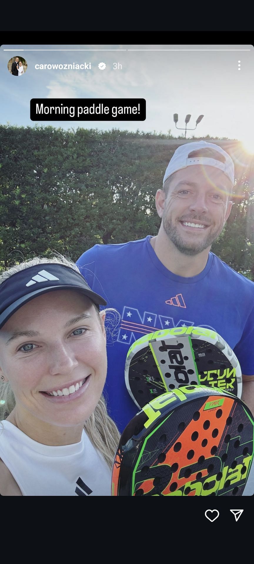 Wozniacki took to her Instagram story to post a picture of herself with Lee holding paddle rackets, with the caption: