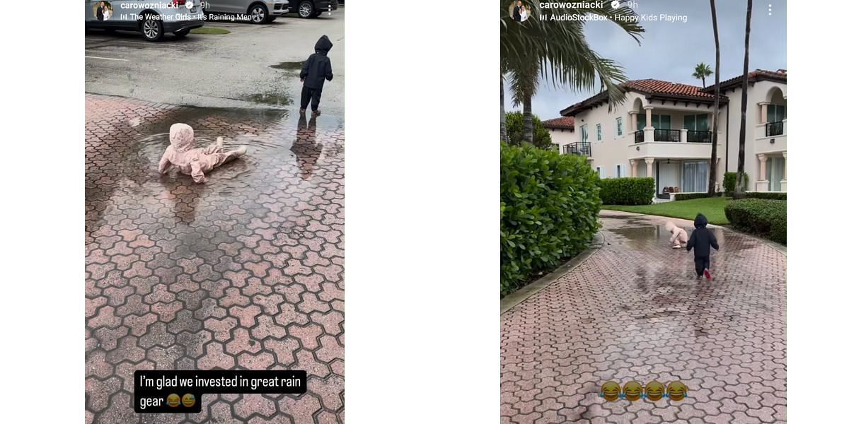 Wozniacki recently shared an adorable clip of her kids having fun on a rainy day on Instagram. Her daughter, Olivia, delighted in lying on a puddle and splashing the water with her arms, while her son, James, preferred to run through the water.