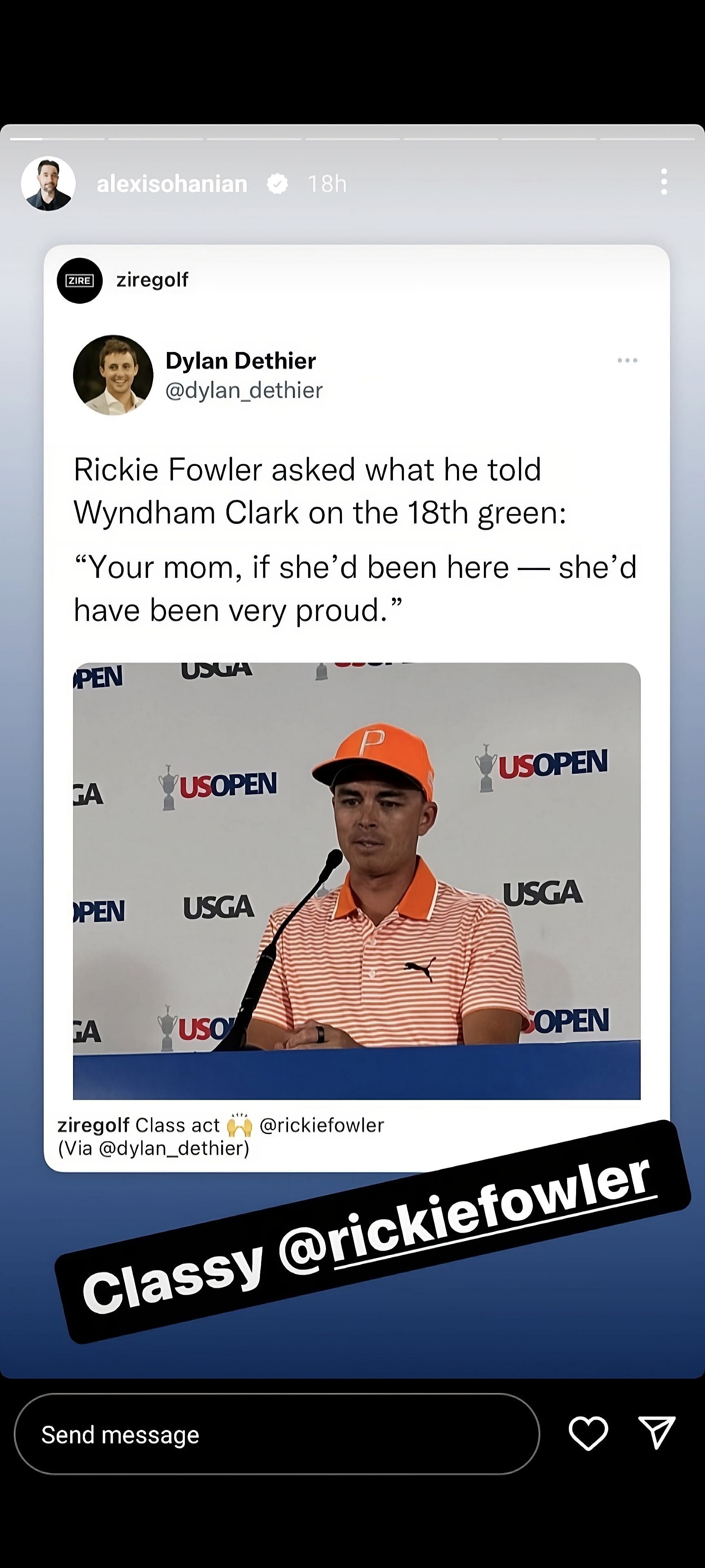 Serena Williams' husband Alexis Ohanian recently shared a post that highlighted Rickie Fowler’s emotional message to Wyndham Clark on the 18th green at the US Open.