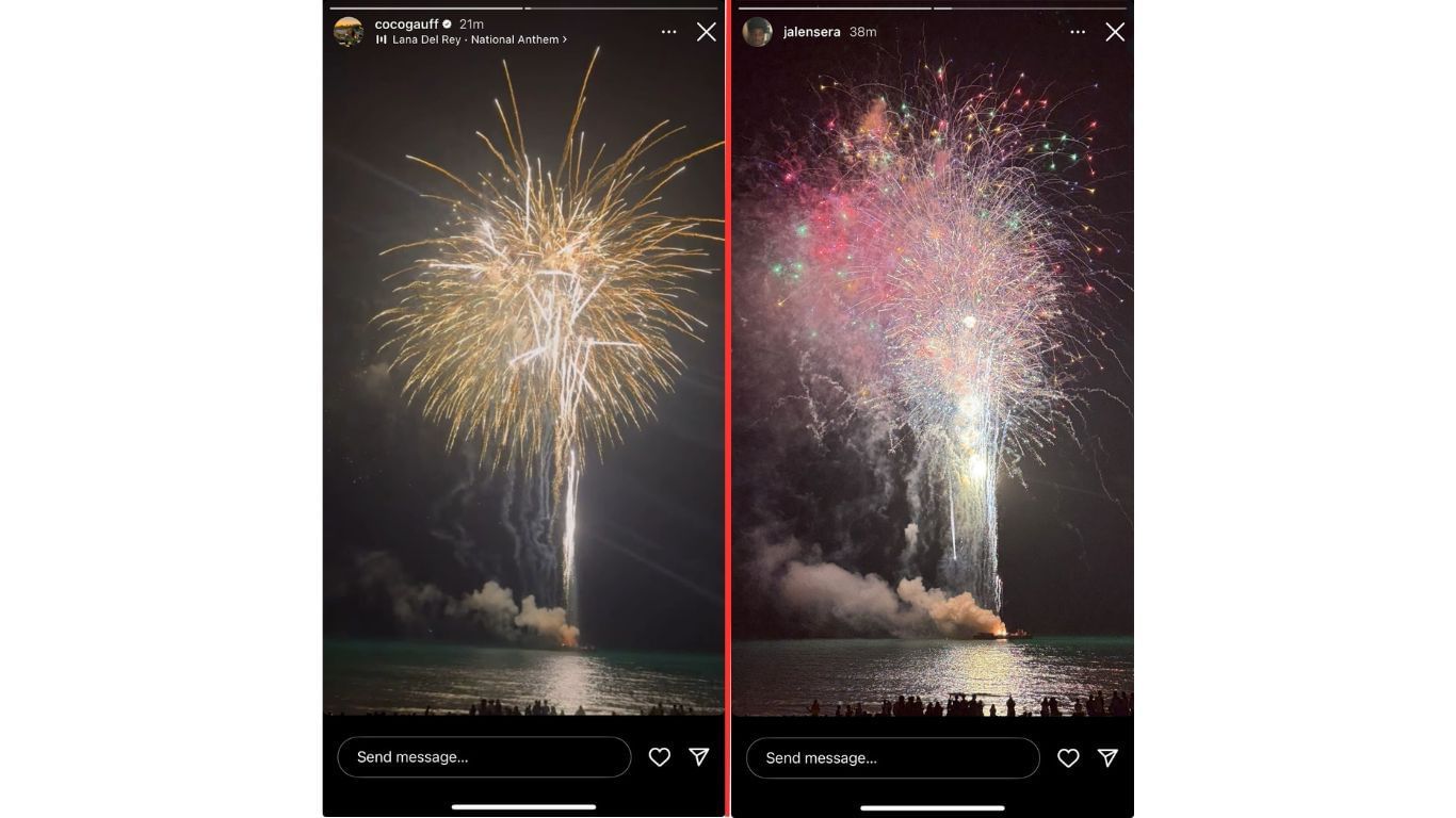 Gauff added a video to the same story showing the night sky lit up with fireworks bursting in the colors of the American flag. She added the song "National Anthem" by singer and songwriter Lana Del Rey to the video. Sera also added a picture from the evening, suggesting that the couple was together in celebration.