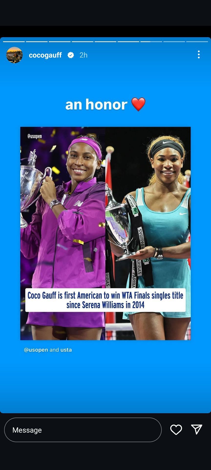 Gauff recently highlighted this achievement by sharing the US Open's post on her Instagram story.