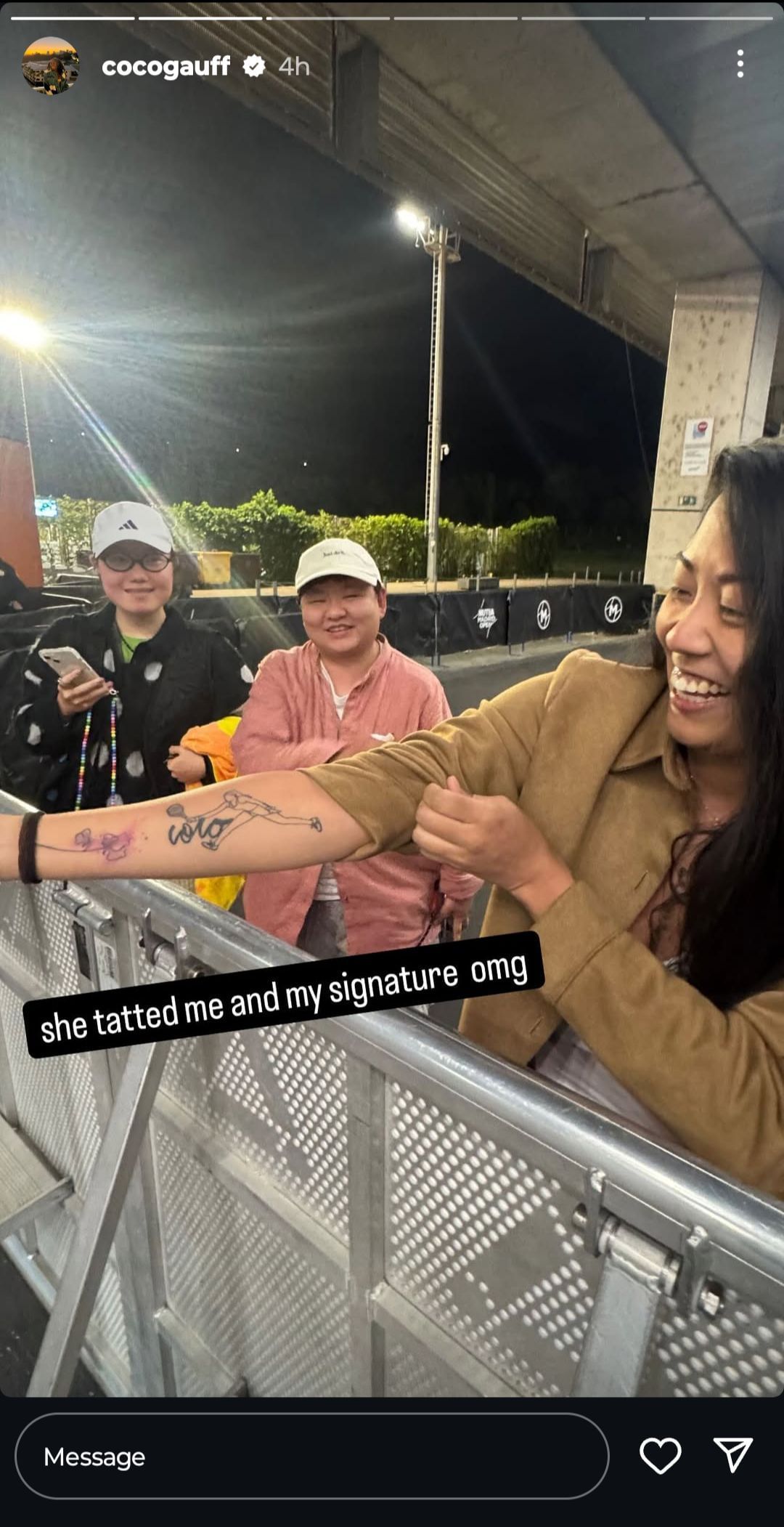 After her late-night opening match against Yastremska, Gauff was surprisingly greeted by a fan who had tattooed her signature alongside a silhouette of the 21-year-old in action.
