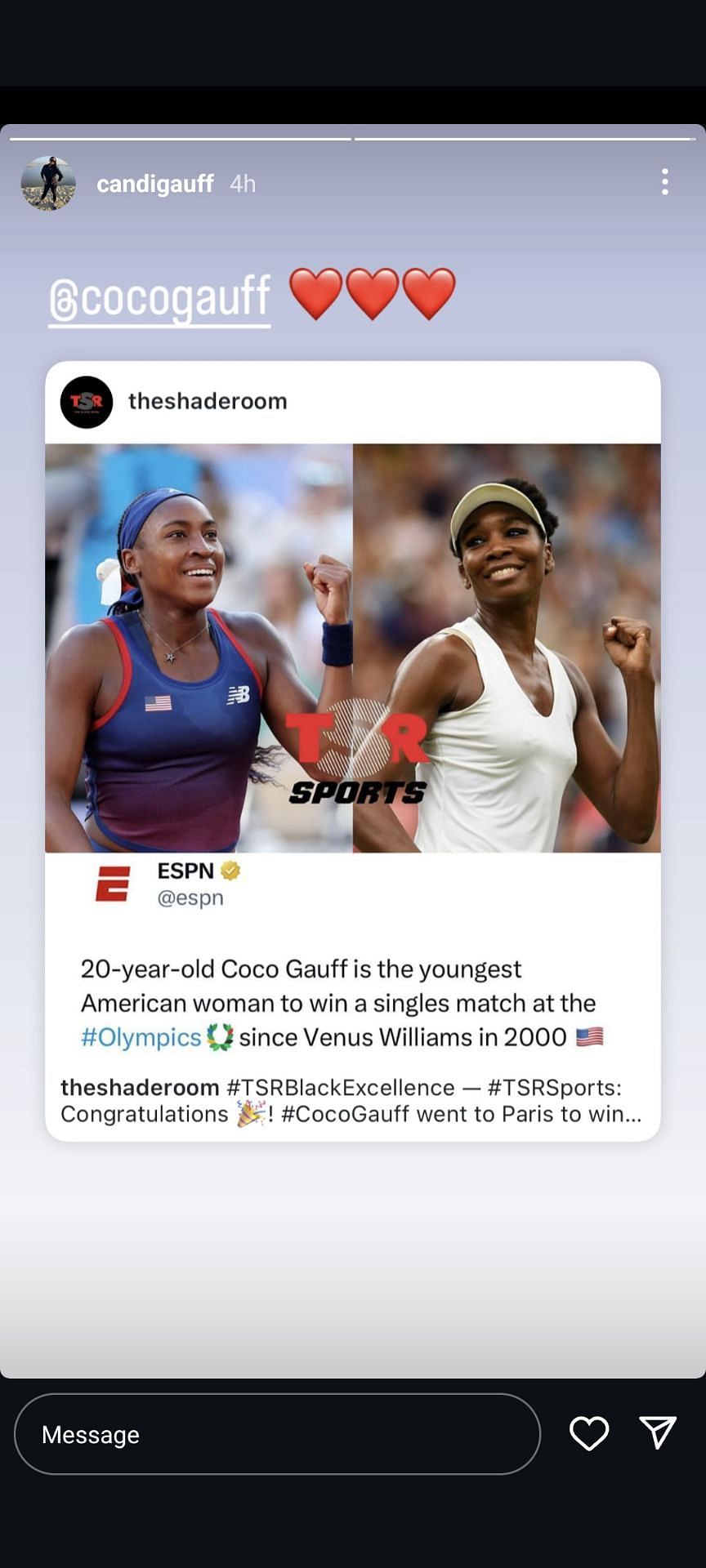 Candi Gauff, Coco's mother, took to her Instagram Story to celebrate her daughter's achievement: