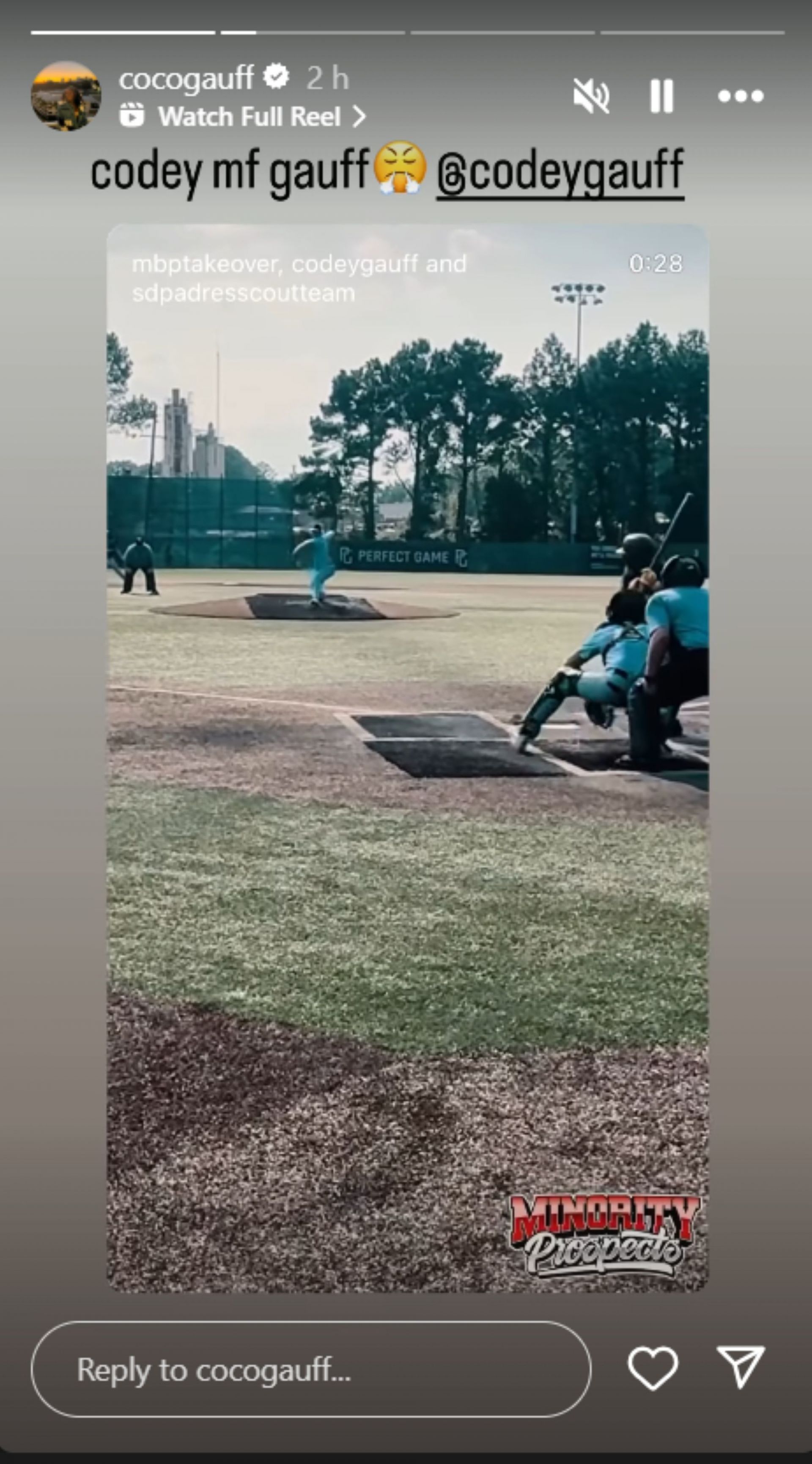 At a WWBA showcase, Codey, playing for the San Diego Padres scout team, hit a monstrous home run. Coco reposted a clip on IG story with a playful caption: