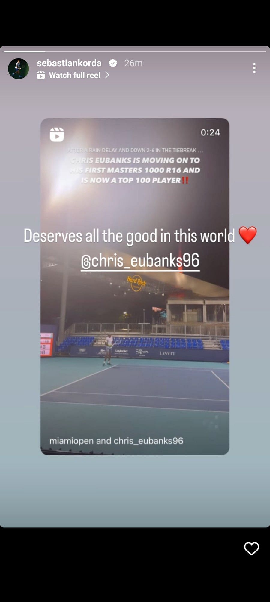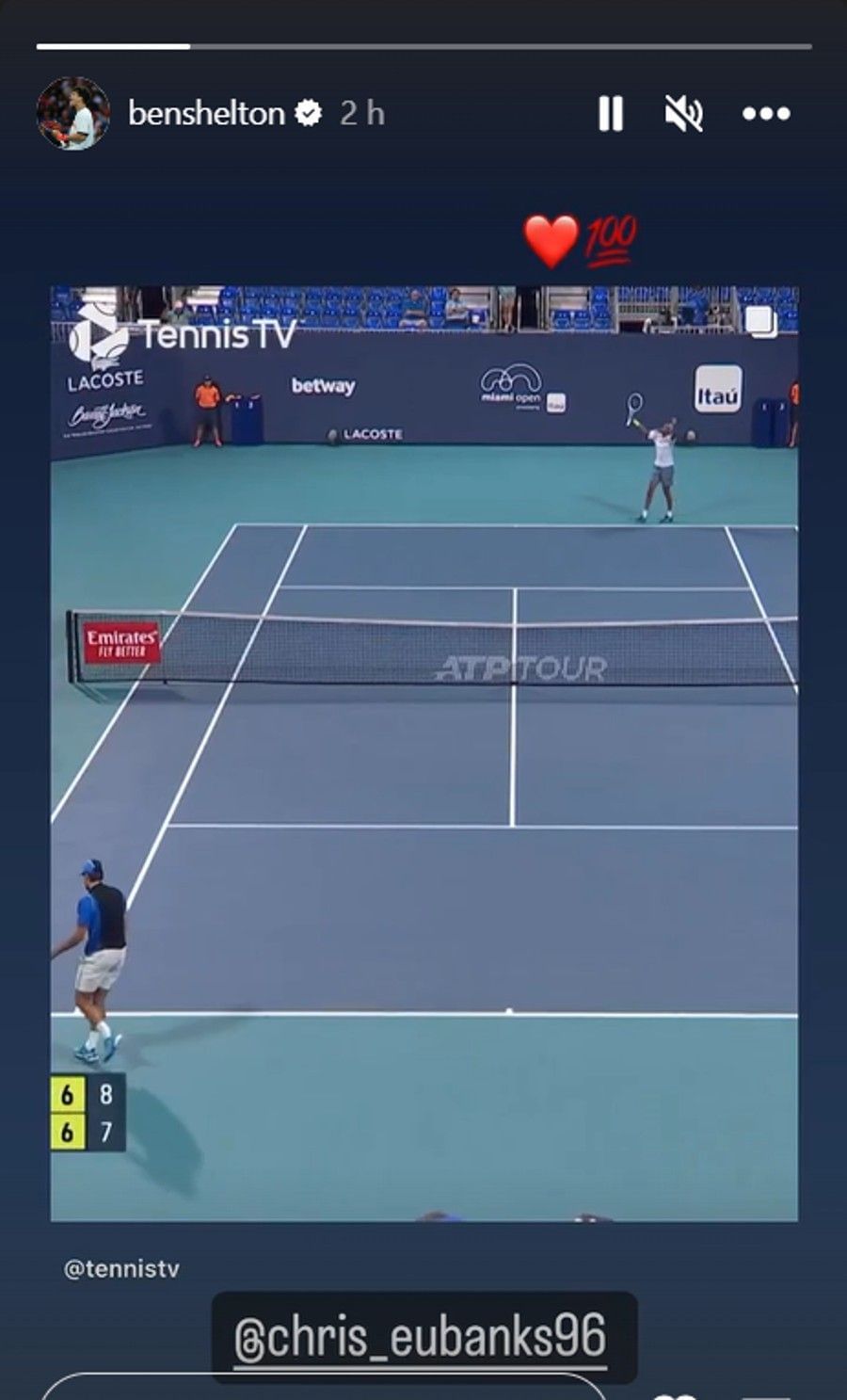 Ben Shelton congratulated the 26-year-old on his win as well, adding a heart emoji and a 100 emoji on his Instagram story.