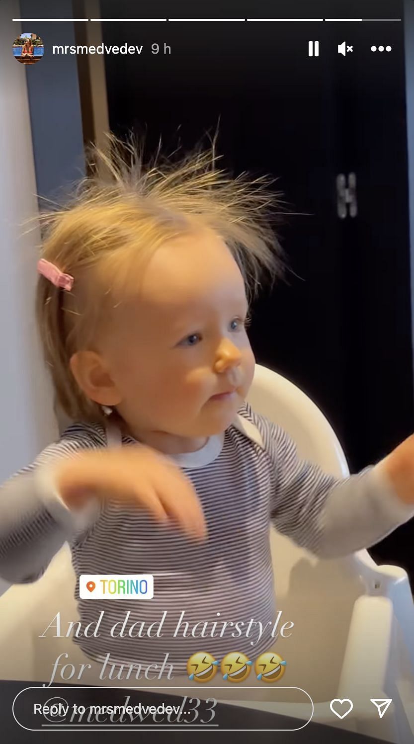 On returning to Turin, Daria prepared lunch for Alisa and shared a clip of the one-year-old eagerly anticipating her meal, with her hair sticking up at odd angles. Medvedev's wife jokingly remarked that the toddler was channeling her father's messy hair for the meal.
