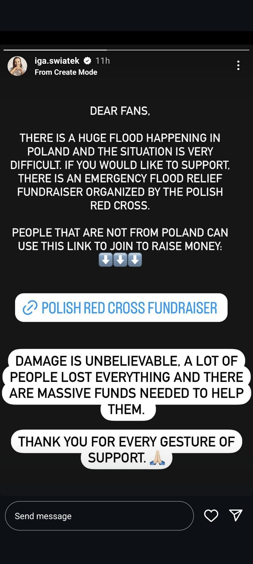 "Dear fans, there is a huge flood happening in Poland and the situation is very difficult. If you would like to support, there is an emergency flood relief fundraiser organized by the Polish Red Cross. People that are not from Poland can use this link to join to raise money," Swiatek wrote on her Instagram Story.