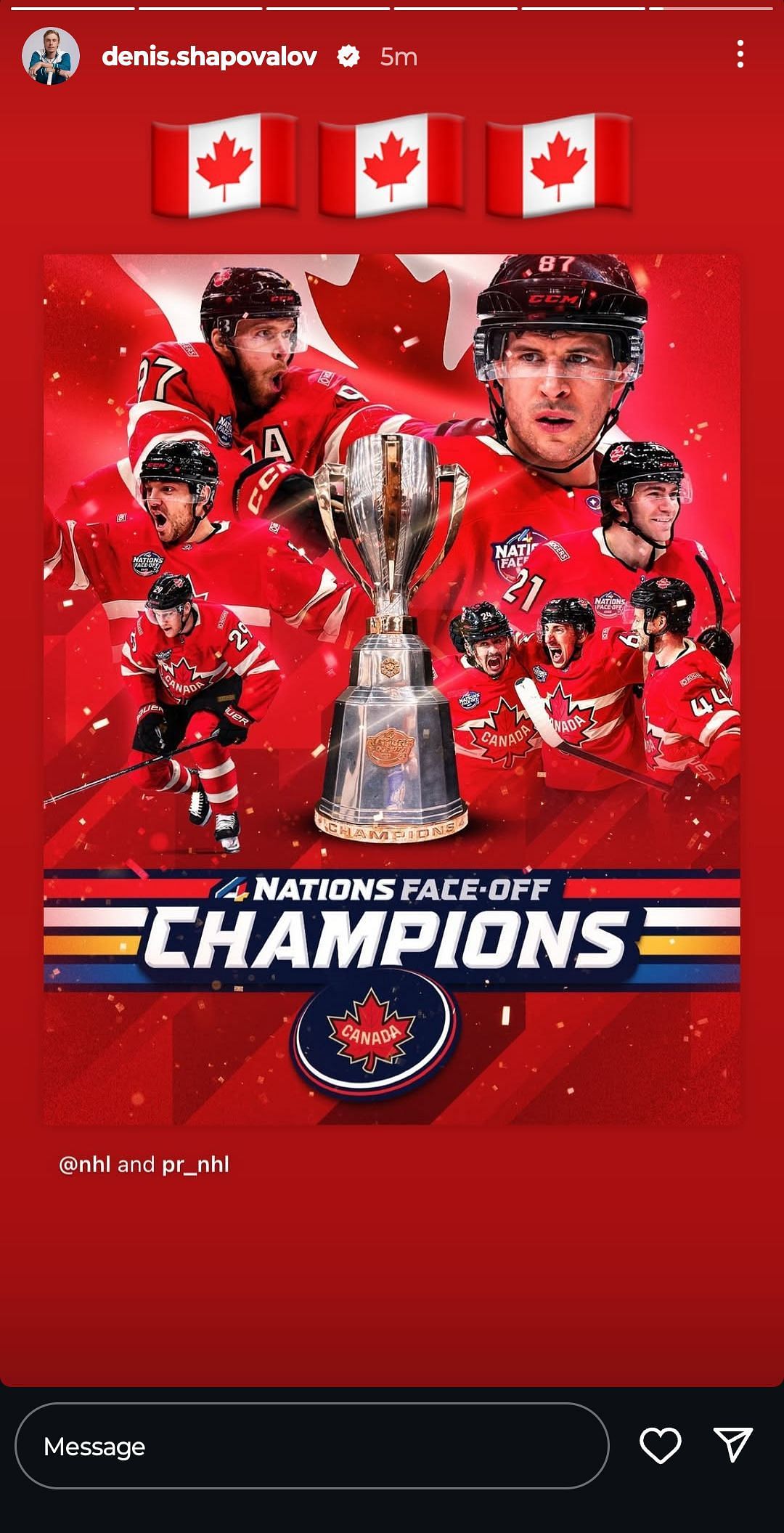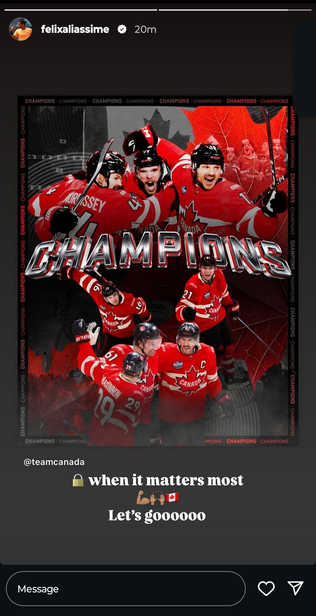 Canadian tennis star Denis Shapovalov immediately took to Instagram to celebrate the win. He shared a post by the NHL's official page and added three Canadian flag emojis.
