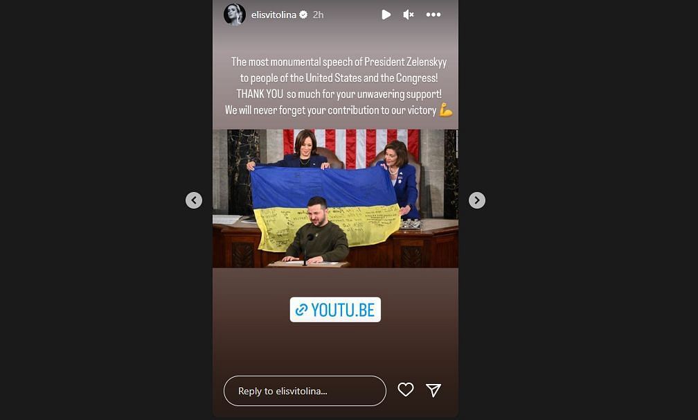 "The most monumental speech of President Zelenskyy to people of the United States and the Congress! THANK YOU so much for your unwavering support! We will never forget your contribution to our victory!" Elina Svitolina wrote on Instagram Stories.