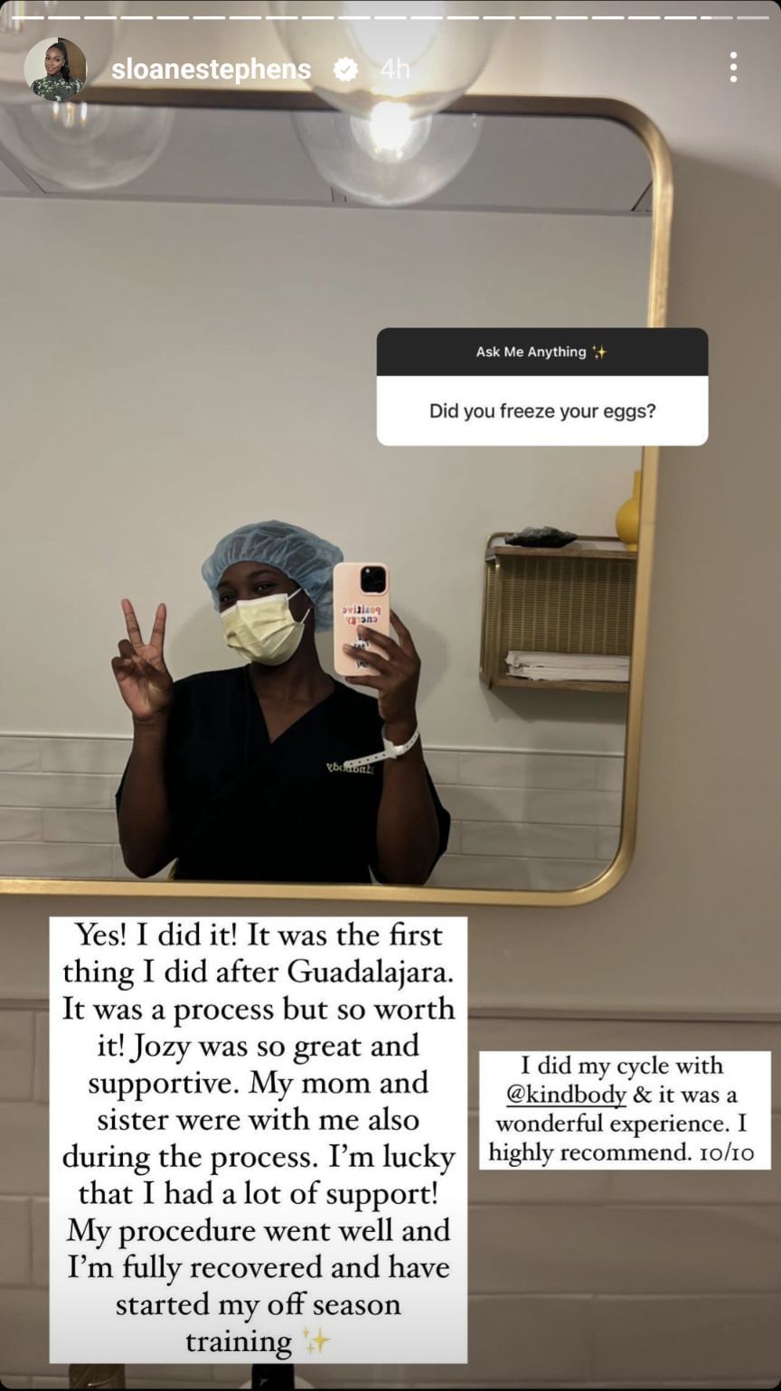 In an interaction with fans on Instagram, Stephens confirmed that she had frozen her eggs after a fan asked her a question about it. The former World No. 3 went on to say it was a worthwhile process, before adding that she was lucky to have the support of her mother and sister the whole time.