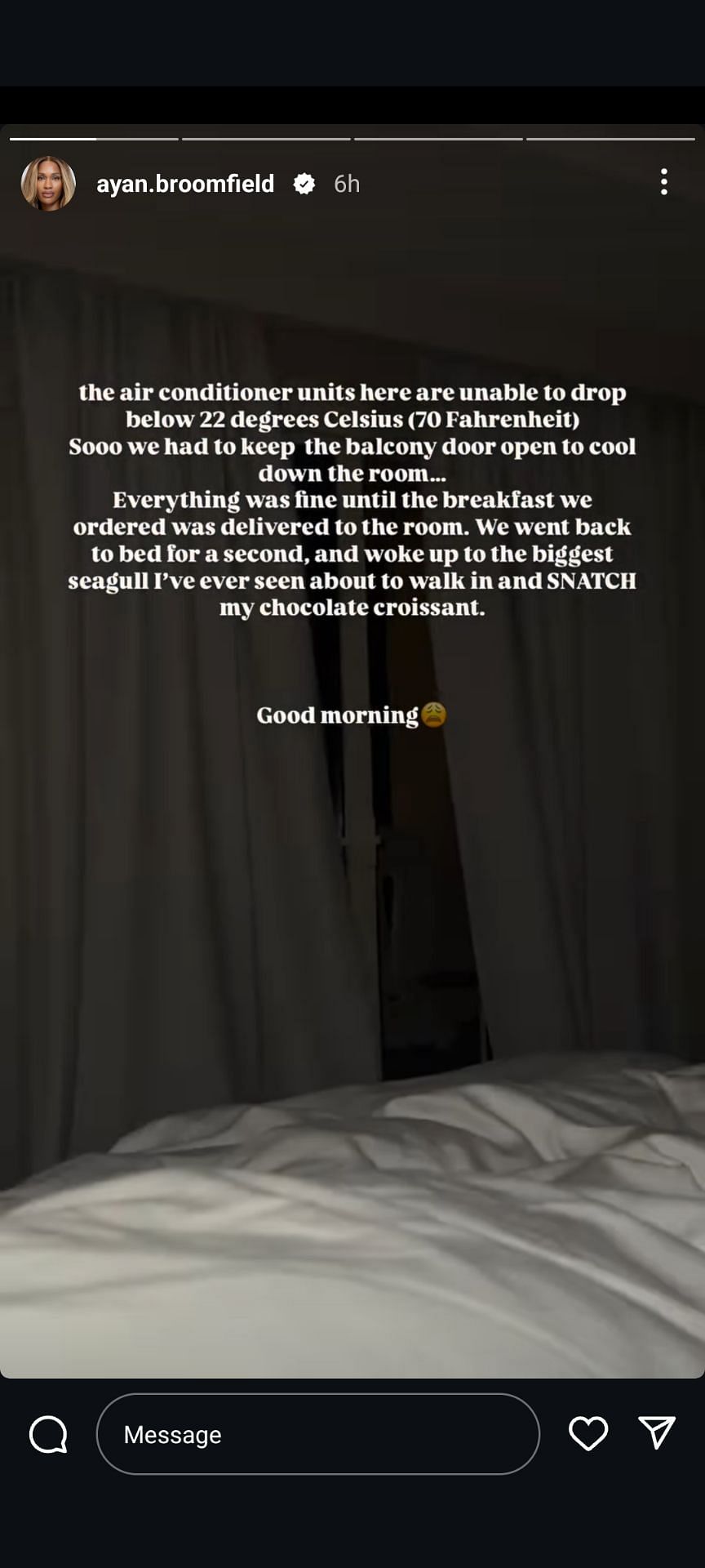 The 27-year-old added that everything was fine until the breakfast arrived. After lying down for a bit, they woke up to a giant seagull, which was about to snatch Broomfield's chocolate croissant.