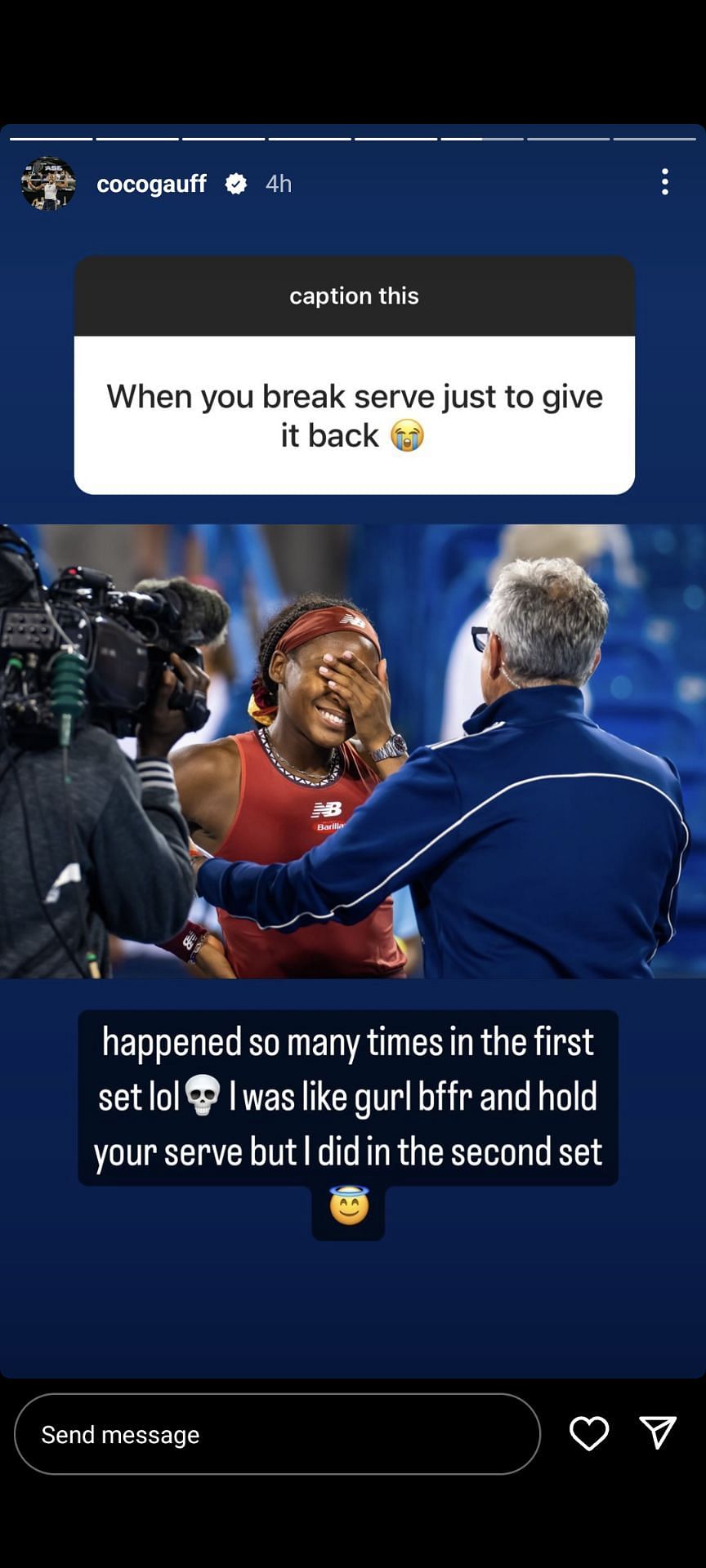 "Happened so many times in the first set, lol. I was like gurl bffr and hold your serve but I did in the second set," Gauff wrote in an Instagram Story.