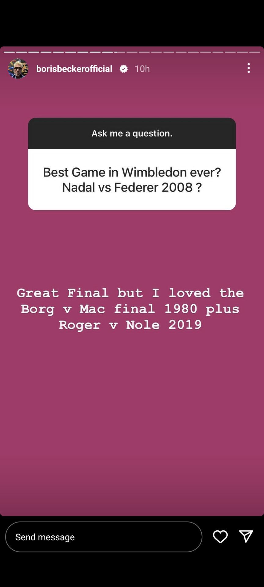 "Great final but I loved the Borg vs Mac final 1980 plus Roger vs Nole 2019," Becker captioned his Instagram story.