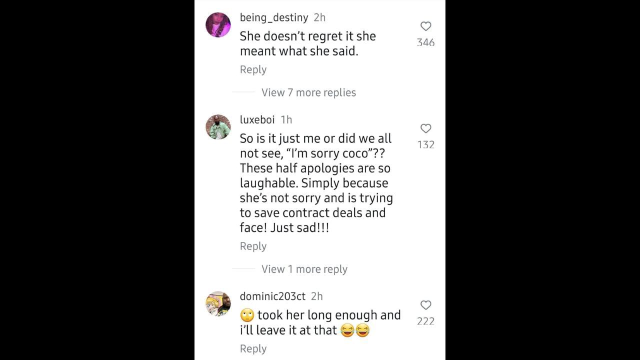 “So is it just me or did we all not see, ‘I'm sorry Coco’?? These half apologies are so laughable. Simply because she's not sorry and is trying to save contract deals and face! Just sad!!!” one user wrote.