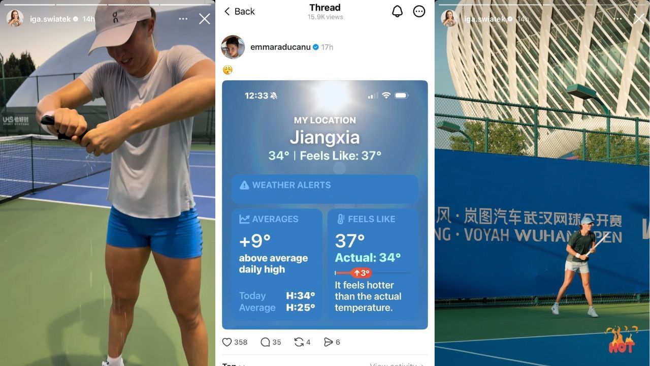 On Monday, Raducanu shared an update from Jiangxia, where temperatures hit 34°C (93°F) but felt like 37°C (99°F). She dropped a single emoji to sum up the struggle:
