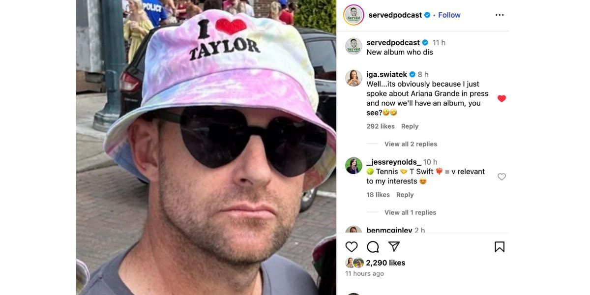 Andy Roddick's Served podcast celebrated the news with an amusing snap of the former World No. 1 decked out in Taylor Swift merchandise. Iga Swiatek humorously chimed in on the post, joking that Swift's move was "obviously" a response to her gushing about Ariana Grande at the Cincinnati Open.
