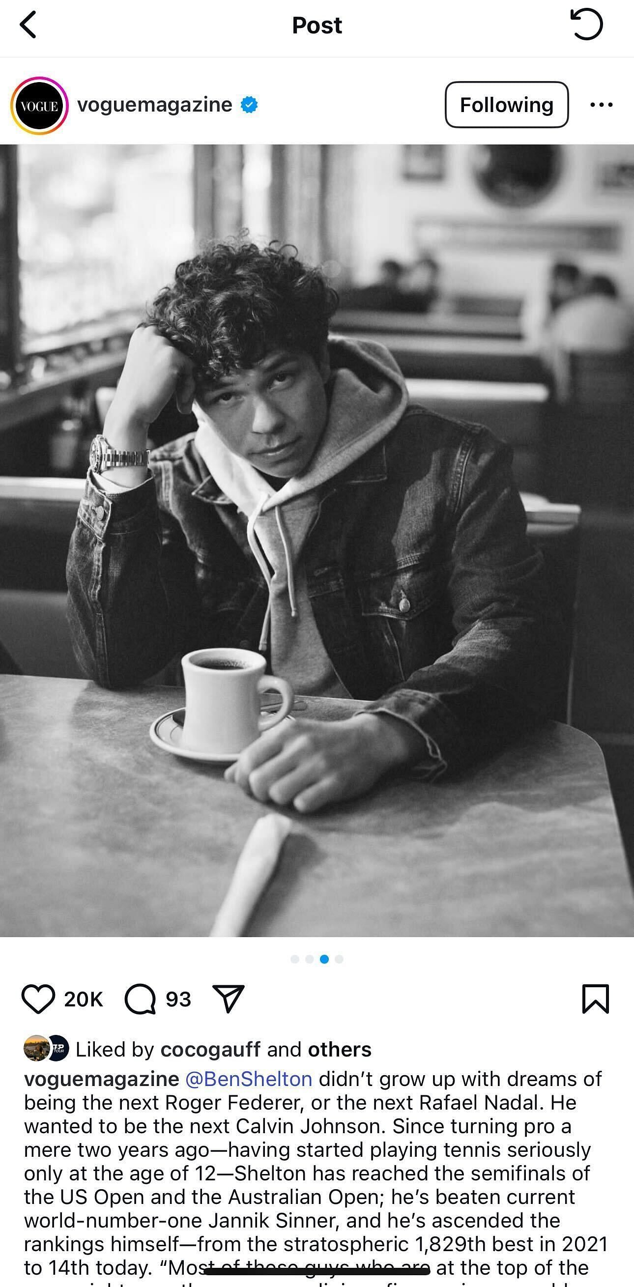 The magazine shared a four picture carousel of Shelton through their official handle on Instagram. One of the pictures showed the US Open semifinalist donning a hoodie with a denim jacket on top looking at the camera with a steaming cup of coffee.