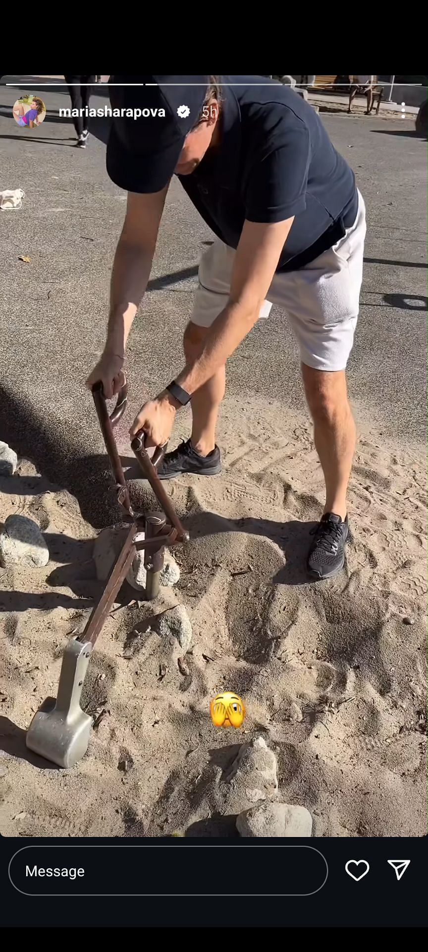 In another story, she shared a video of her fiancé Alexander Gilkes trying out what appeared to be a manual sandbox excavator, which is often found in children's playgrounds.