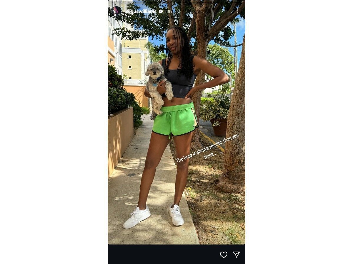 Williams recently shared a glance of her walks with Reginald, where she was seen holding her dog in her arms and donned a black crop top paired with light-green colored shorts and white sneakers. Her first story carried a video of both of them together where Venus Williams waved his paws at the camera and wrote: