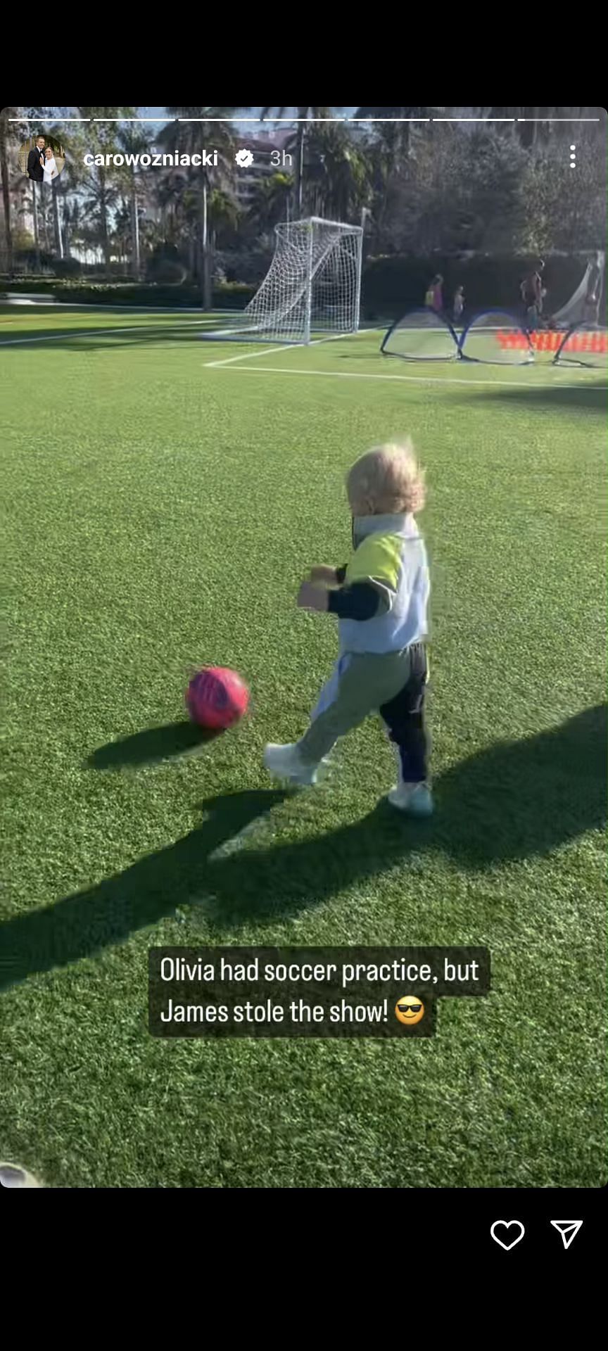 Caroline Wozniacki recently posted a video of her one-year-old son James showing off his skills on the soccer pitch during what was supposed to be his sister Olivia's practice session.