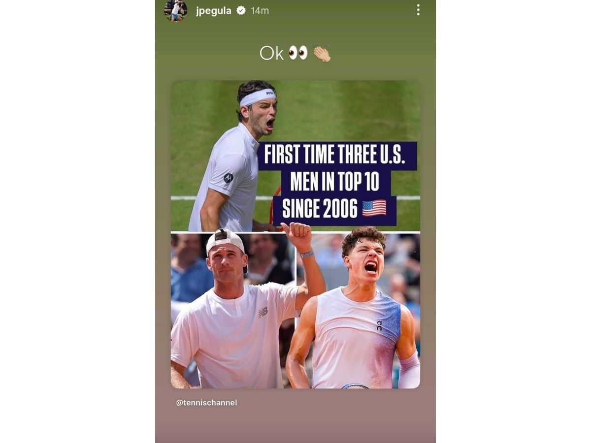 This remarkable achievement of Ben Shelton being on No. 10, with Fritz on No. 4 and Paul on No. 8, was shared by the Tennis Channel on Instagram. This garnered the attention of World No. 3, Jessica Pegula, who reshared the post on her Instagram story and dropped a one-word reaction that read:
