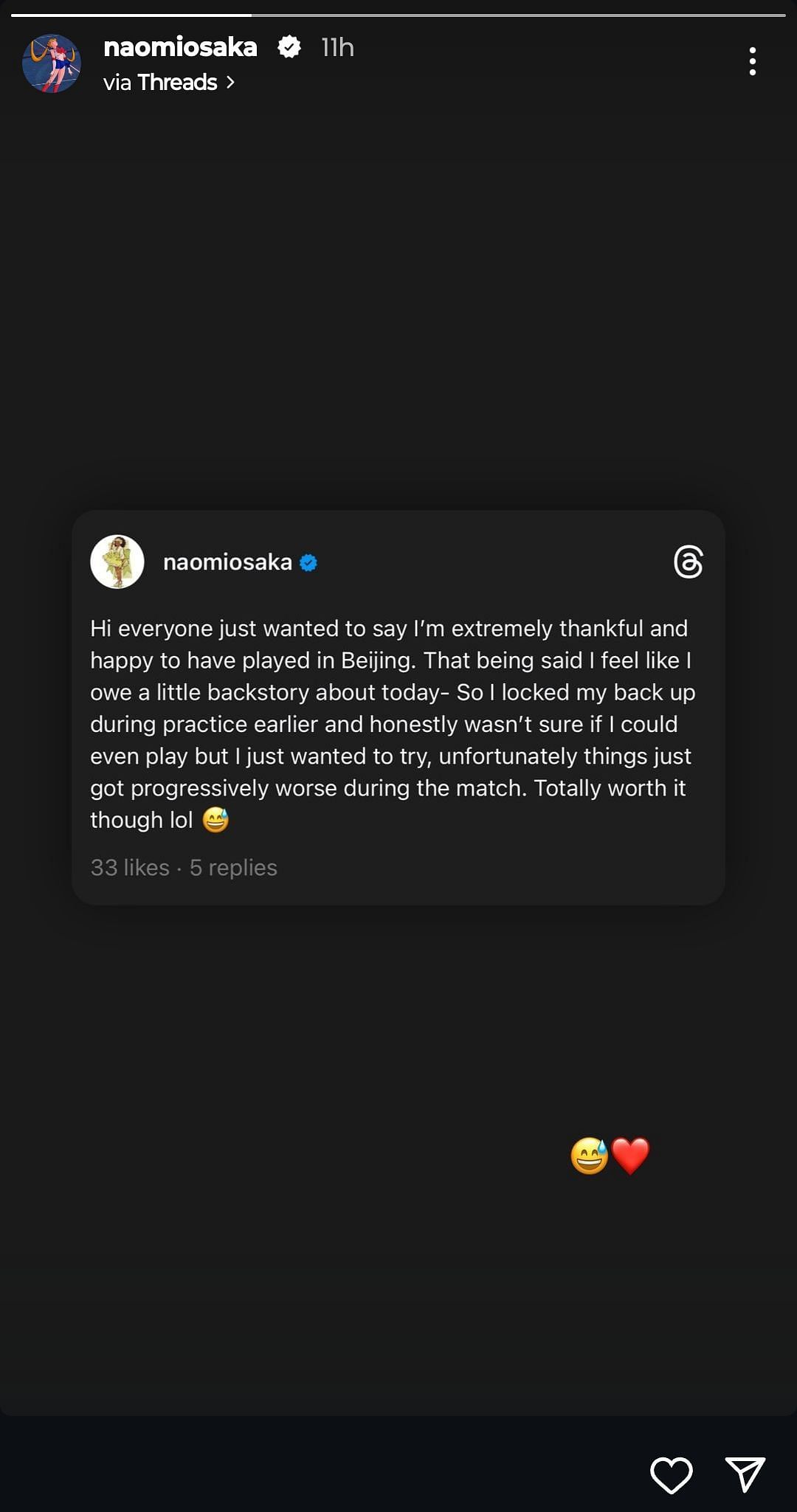 "Hi everyone just wanted to say I’m extremely thankful and happy to have played in Beijing. That being said I feel like I owe a little backstory about today- So I locked my back up during practice earlier and honestly wasn’t sure if I could even play but I just wanted to try, unfortunately things just got progressively worse during the match. Totally worth it though lol," Naomi Osaka wrote.