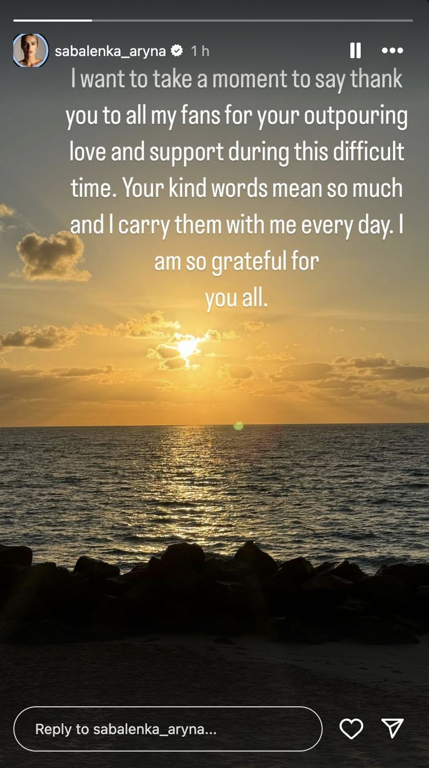 Aryna Sabalenka has shared a heartfelt message of gratitude for the support she has received since the death of her ex-boyfriend, Konstantin Koltsov.