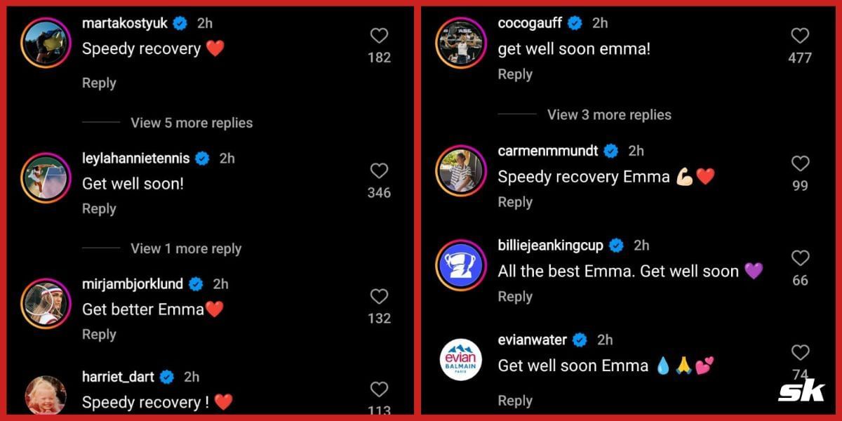The post also saw Emma Raducanu's Billie Jean King Cup teammate Harriet Dart and countrywoman Naomi Broadly wishing her well. While Dart left a "Speedy recovery" message, Broady commented with a series of heart emojis on the post.