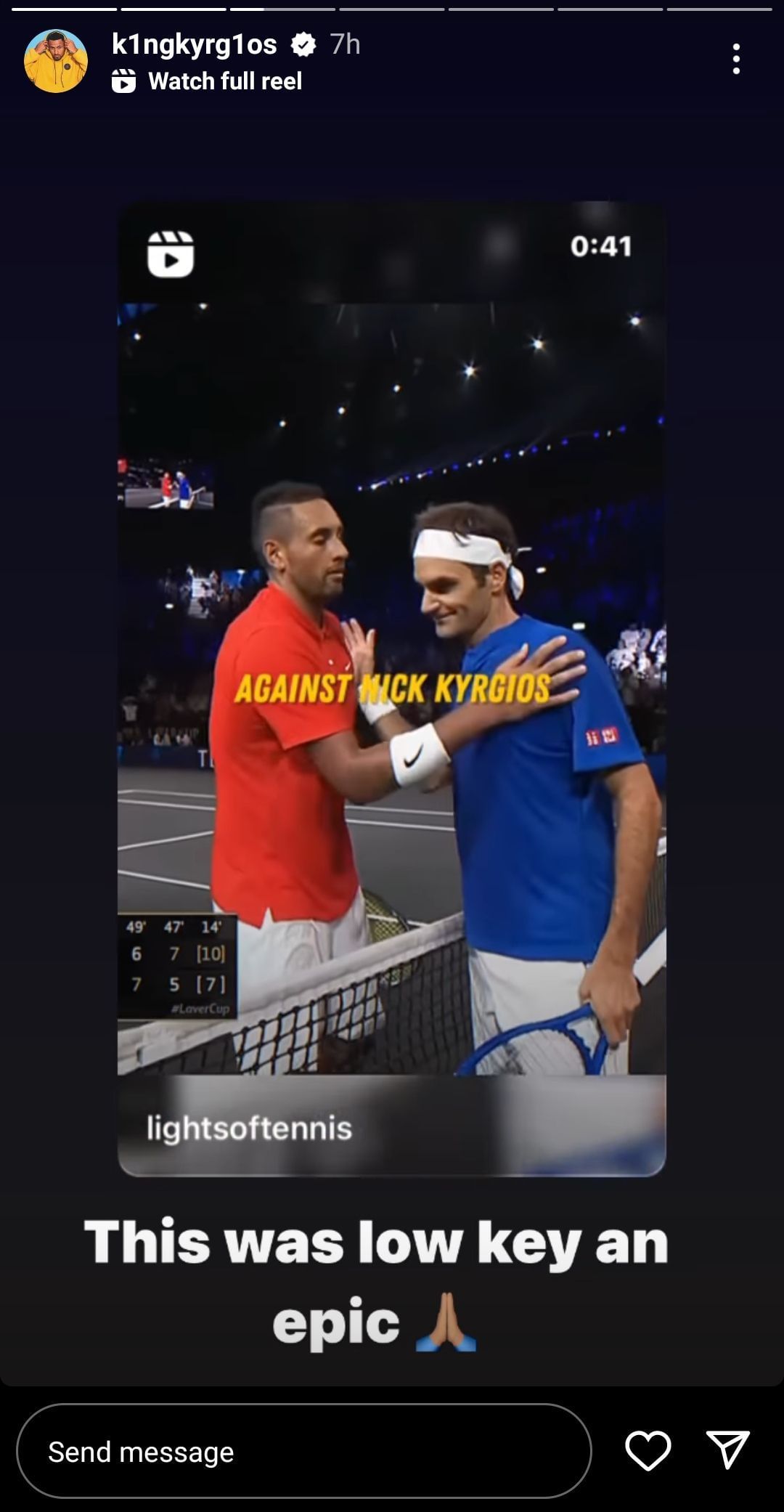 Recently, a video focusing on Federer and Kyrgios' memorable match surfaced on social media and drew the Australian's attention. Kyrgios re-shared the video on Instagram and captioned his Story: