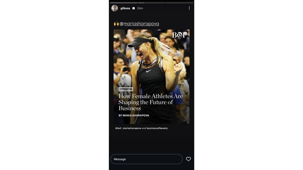 Gilkes shared Sharapova's article, written for The Business of Fashion, on Instagram stories. The couple began dating in 2018, when the latter was still an active player on the WTA Tour. They got engaged in 2020, the same year when the Russian decided to retire.