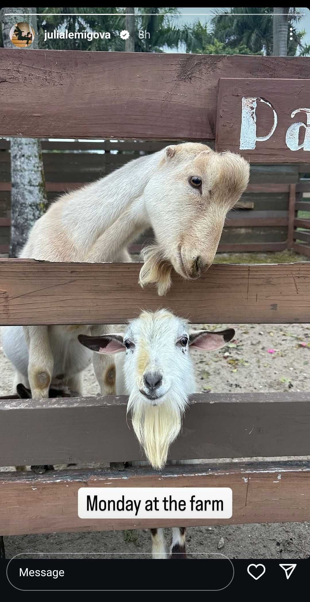 Taking to Instagram, Lemigova shared a snap showing two white goats peering through a wooden fence on her farm. One of the goats gazed directly at the camera with a distinctive white beard. The Instagram story included the caption:
