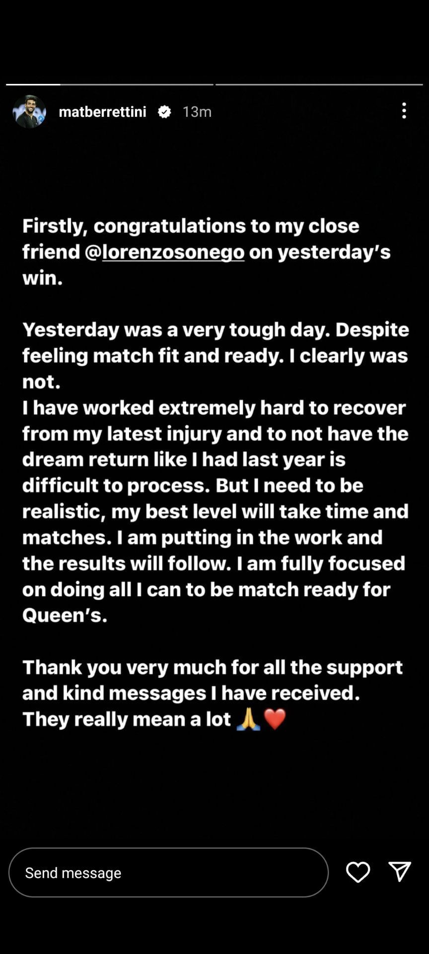 "Firstly, congratulations to my close friend Lorenzo Sonego on yesterday's win. Yesterday was a very tough day. Despite feeling match fit and ready. I clearly was not," he wrote on Instagram.