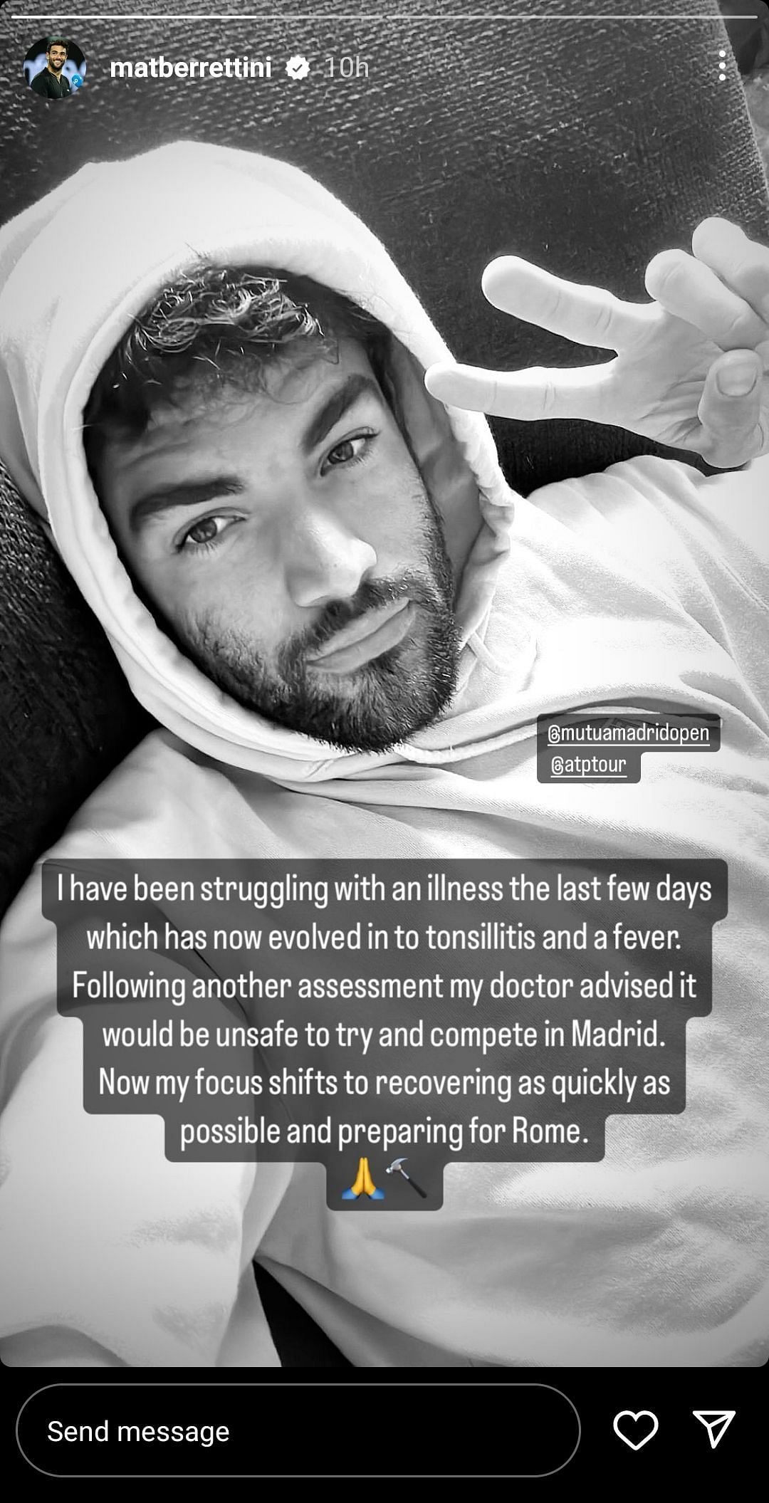"I have been struggling with an illness the last few days which has now evolved into tonsillitis and a fever. Following another assessment my doctor advised it would be unsafe to try and compete in Madrid," Berrettini wrote in an Instagram post.
