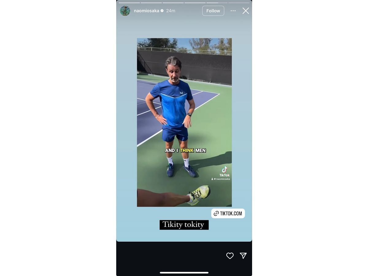Osaka shared a TikTok video on her Instagram story, showcasing the reviews she received on her new shoes from her team while they were training. She wore a blue Nike top and paired it with black shorts; Osaka flaunted her new neon shoes with detailed designs on their top corners.
